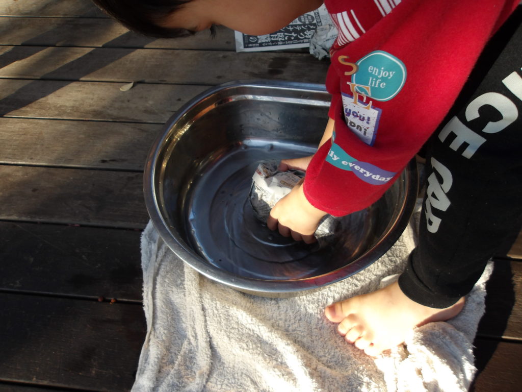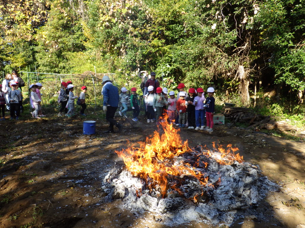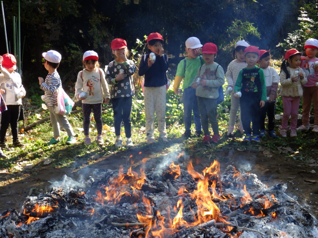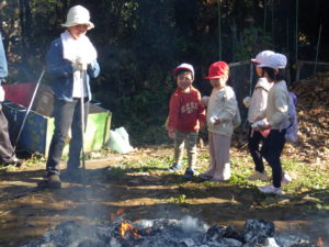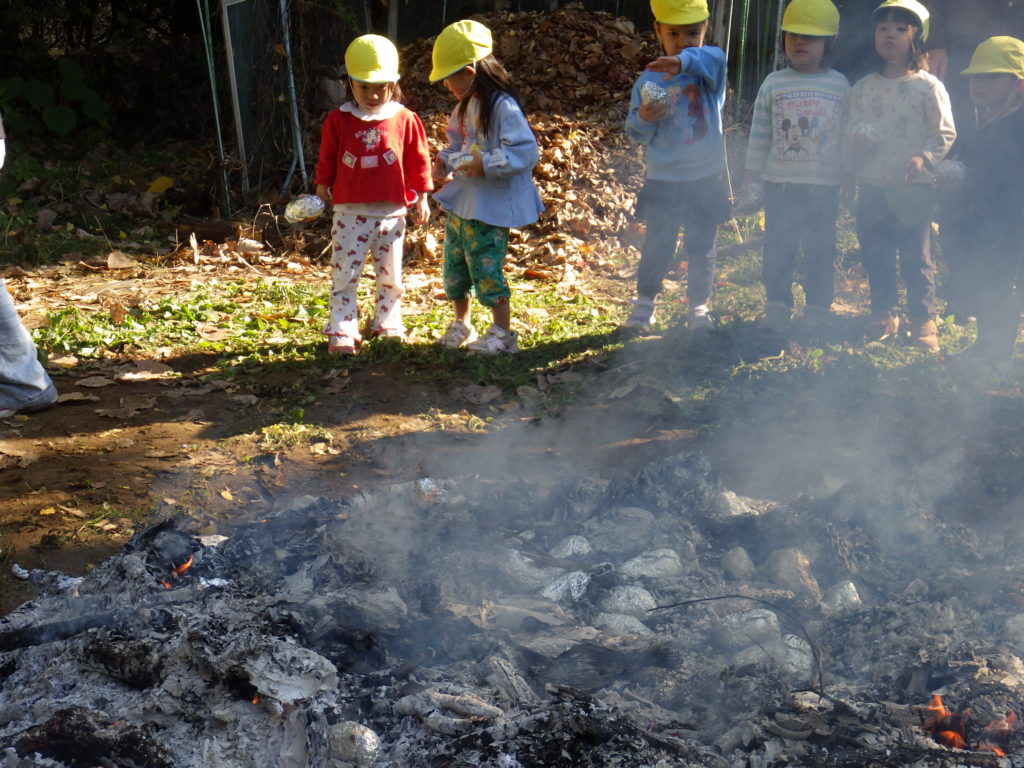 らいおん組、きりん組の子ども達に、芋を投げ込んでもらいました。