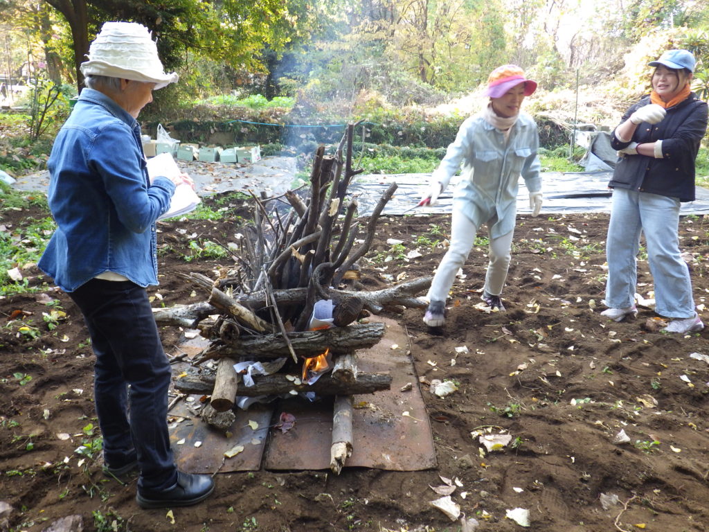 当日は職員と、お手伝いに集まってくださった保護者の方と共に火起こしをしました。理事長の指導のもと、薪を組み、火を育てていきます・・・!