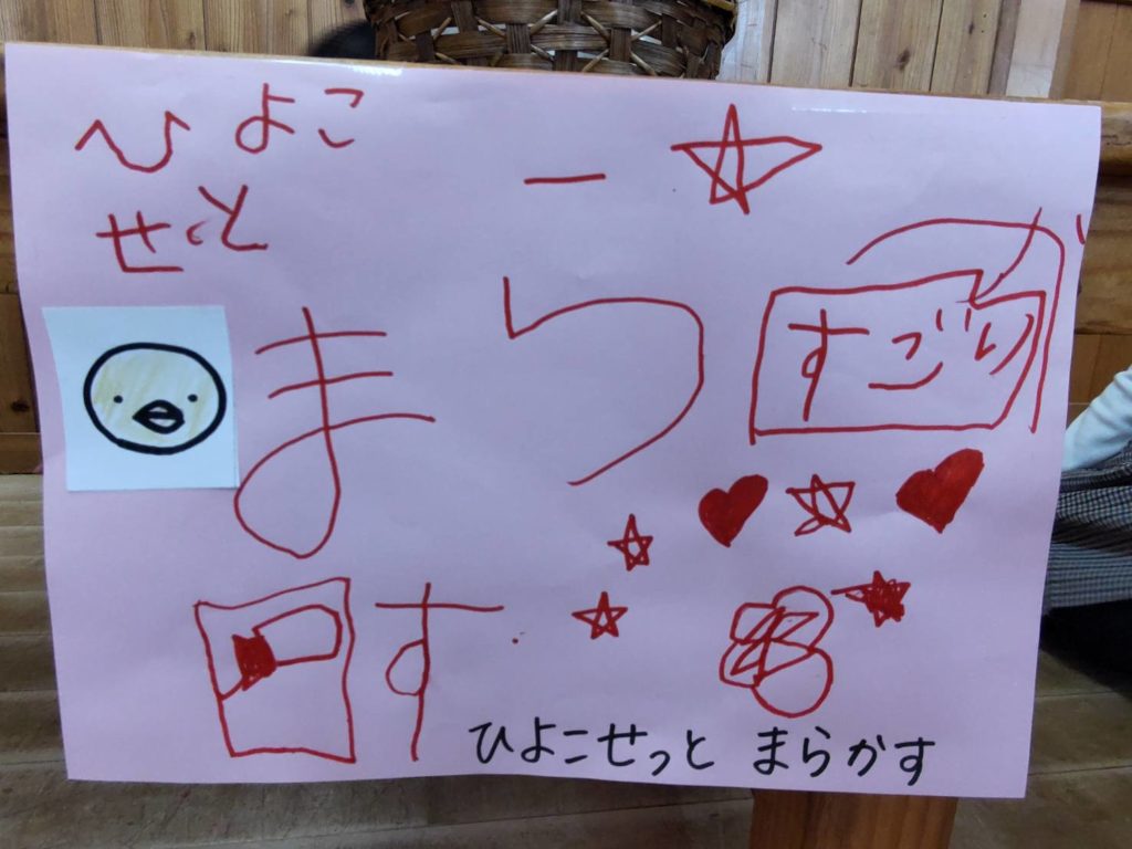 看板は子どもたちの手書きです。