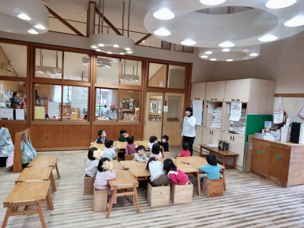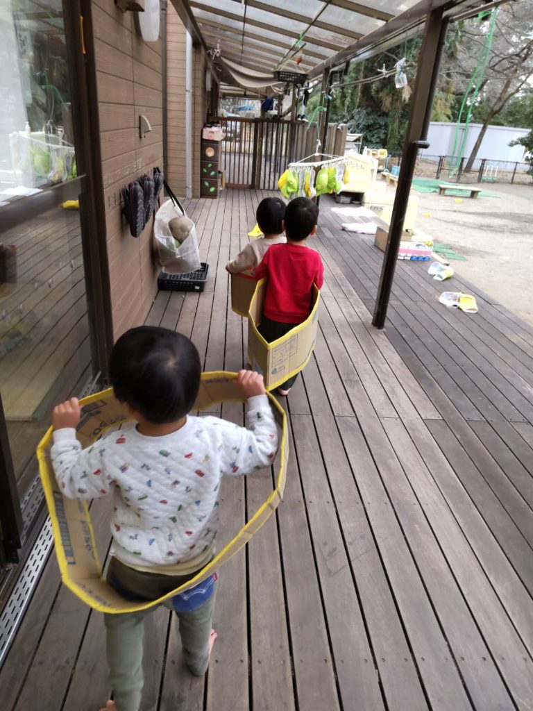 きりん組では、朝の集まりで今日の話を聞いたり、段ボールの電車で楽しむ姿もありました。