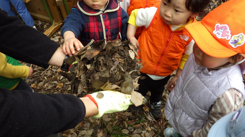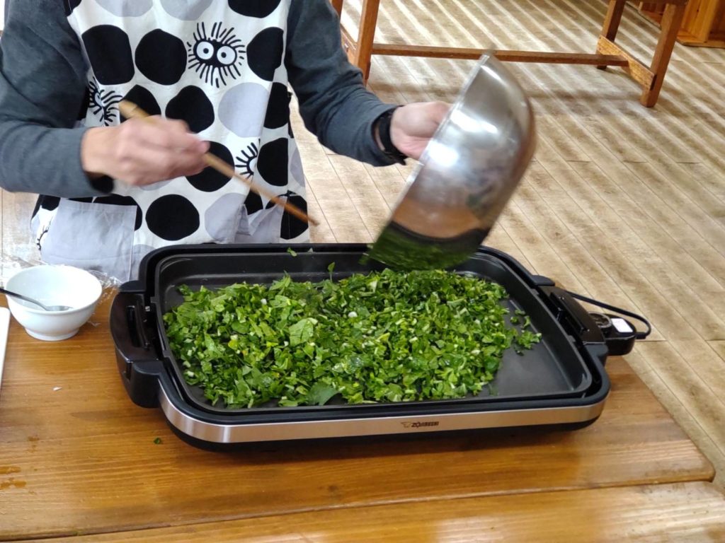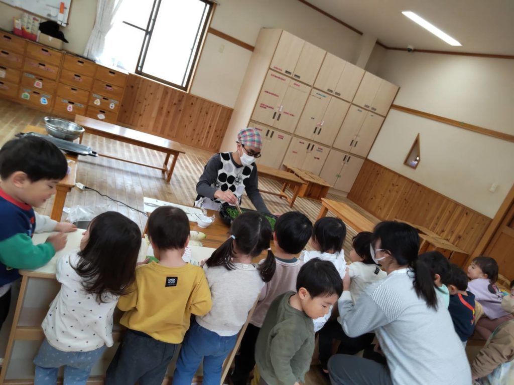くま組(1、2才クラス)が畑で大根を収穫しました。その大根の青々とした葉を担任が代表して、ホットプレートで炒めて昼食時に食べました。