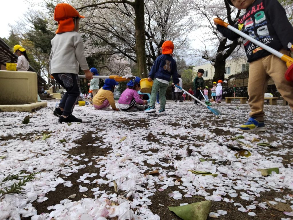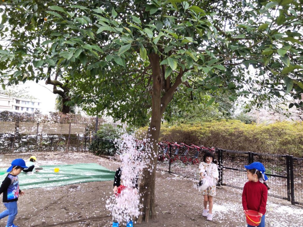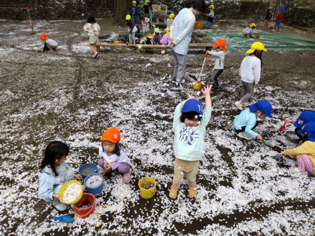 園庭では異年齢の子どもたちが集まり、会話を楽しみながら桜の花びら遊びで盛り上がりました。