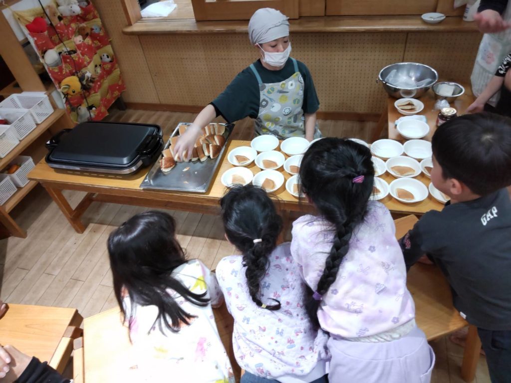 卒園児がいるらいおん組では、おたのしみのビンゴ大会をしたり、おやつは特別に栄養士が実演ホットケーキを振舞ってくれました。
