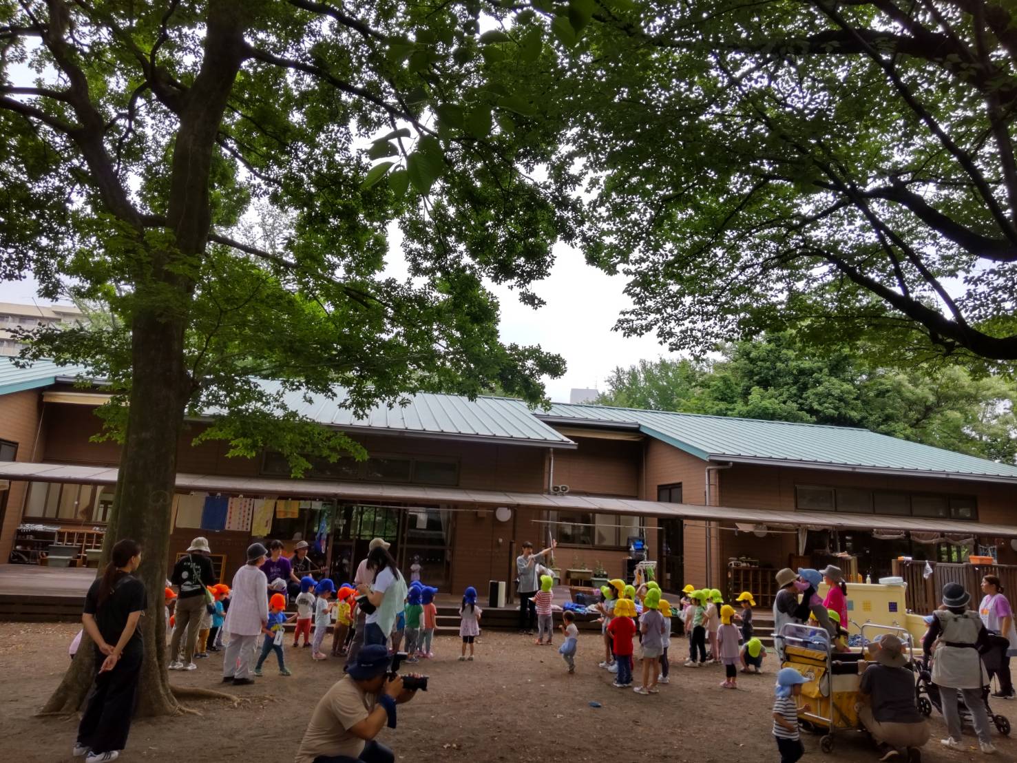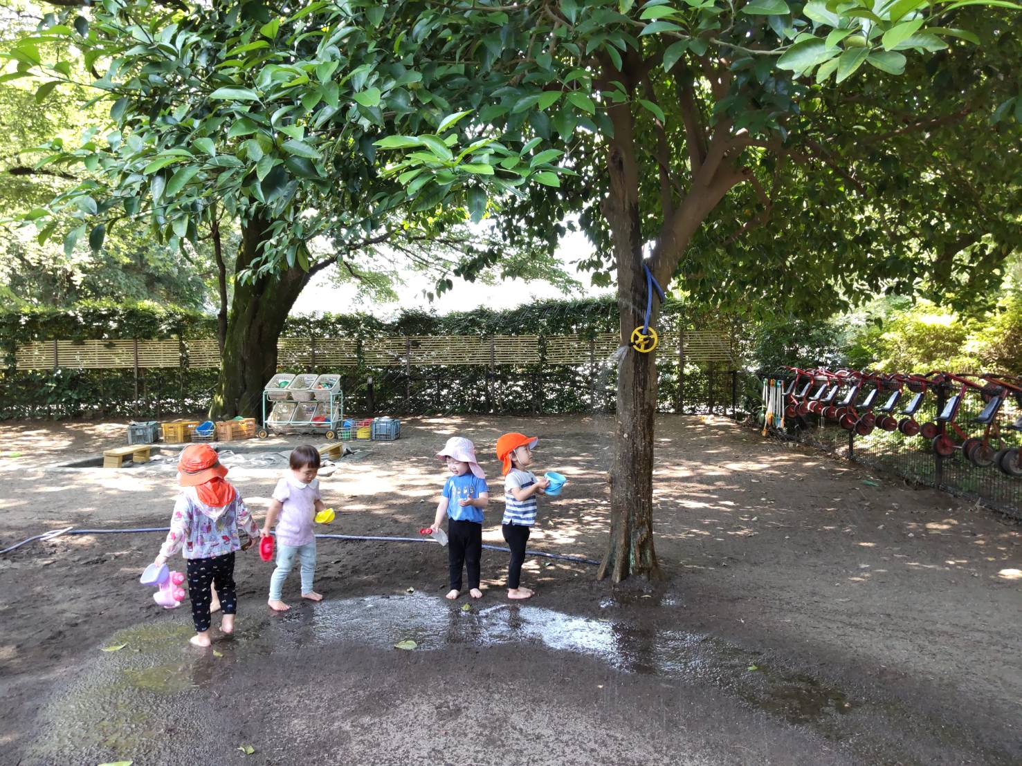 2025.06.19連日暑い日が続いていますね。保育園では暑さ指数計を園庭に設置し指数を参考に活動しています。園庭には木陰が多く、午前中の早い時間は気持ちよく水遊びができました。 暑い時期でも時間を選べば屋外活動…